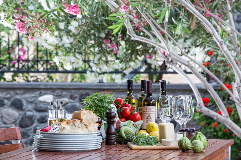 Various outdoor terraces, wrap all around the villa for outside dining and leisure. A large dining table and chairs provide the perfect location for breakfast, lunch or dinner on a distinctive pleasant evening in Santorini.