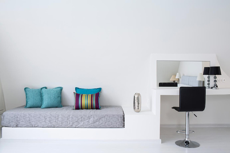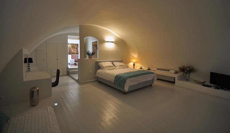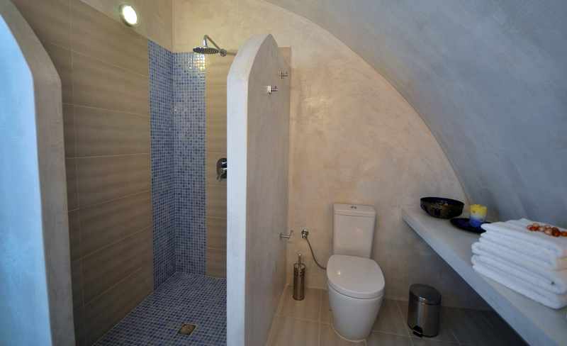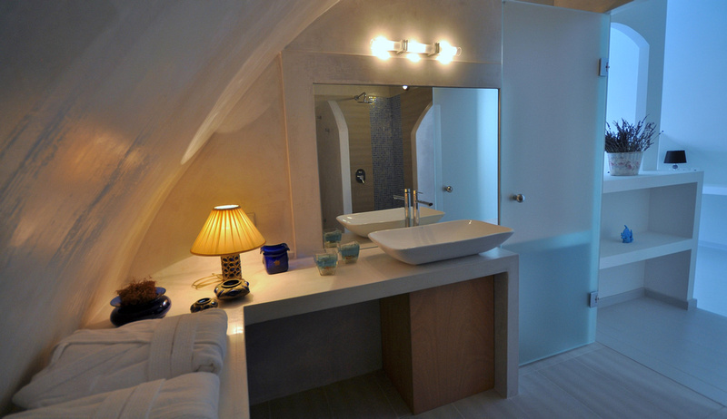 Upon entering, you are guided into a spacious, high-ceiling hallway, which leads to the two living rooms. The atrium in the middle of the first one will instantly take your attention as it is giving the room a real sense of space and light. Moreover, the large sitting room offers to anyone who enjoys visiting Santorini in the cooler months, a beautiful open fireplace in addition to the heating throughout the Villa.