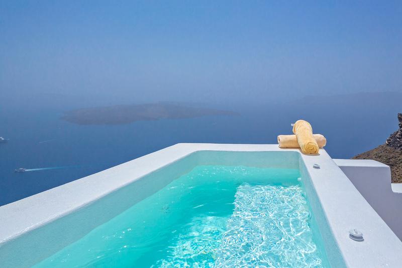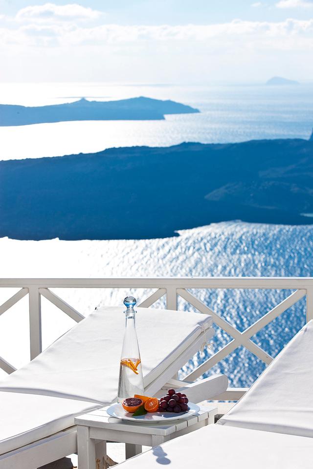 High on the clifftops of Greece’s sunset paradise, emerges gleaming a bright, white, clean-lined suite hotel that wisely lets the views do the talking.